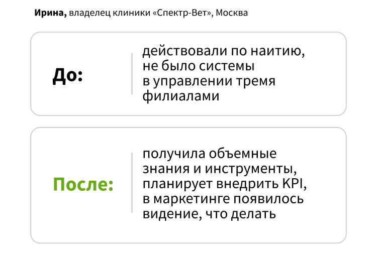 Я хотел упорядочить ведение бизнеса, перейти к регулярному менеджменту, на школе получил новые знания в управлении клиникой. Создал должностную инструкцию врача, понял, что нужен маркетолог, и какие требования к этой должности. Рассчитал точку безубыточности и как работать с фондами. Спасибо Альфие и Юле за работу